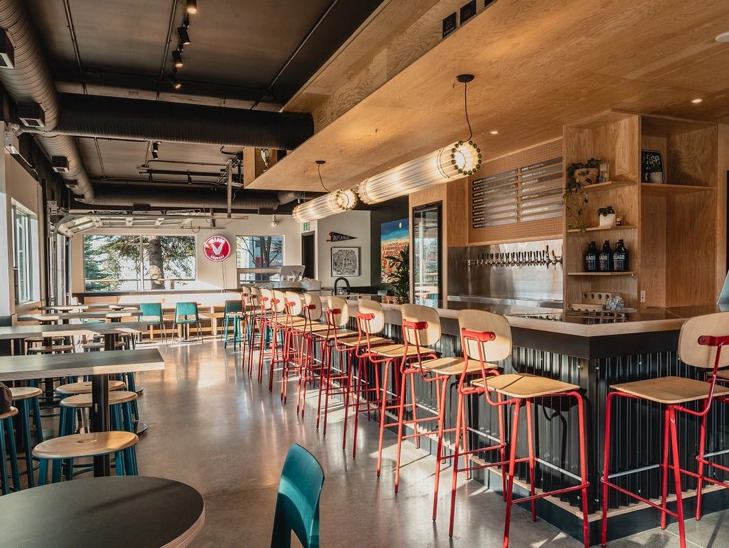 Brightly lit local brewery in an industrial area with spaces available on the upper floor, main taproom or patio